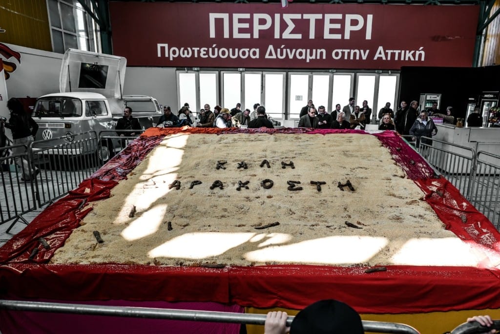Περί τα 320 κιλά αλεύρι τεσσάρων ποικιλιών, 80 κιλά εκλεκτό σουσάμι, 30 λίτρα σησαμέλαιο, 22 κιλά ταχίνι, αλάτι, ζάχαρη και μαγιά ήταν όλα όσα χρειάστηκαν έμπειροι αρτοποιοί από τους φούρνους της γειτονιάς φτάνοντας σε ένα αξιοσημείωτο επίτευγμα.