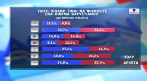 Η πιθανότητα ψήφου σε ένα ενδεχόμενο κόμμα της Μαρίας Καρυστιανού εμφανίζεται αξιοσημείωτα υψηλή, καθώς το 16,1% των πολιτών δηλώνει ότι είναι «πολύ πιθανό» να το στηρίξει, ενώ ένα επιπλέον 13,2% το θεωρεί «αρκετά πιθανό». Τα ποσοστά αυτά δείχνουν ότι η Καρυστιανού έχει ήδη δημιουργήσει ένα ισχυρό ρεύμα ενδιαφέροντος, παρά το γεγονός ότι το κόμμα της δεν έχει ακόμη επίσημα ιδρυθεί. Η δυναμική αυτή αποτυπώνει μια τάση αναζήτησης νέων πολιτικών σχημάτων και προσώπων, σε μια περίοδο όπου η κοινωνία εμφανίζεται κουρασμένη από τις παραδοσιακές κομματικές δομές.