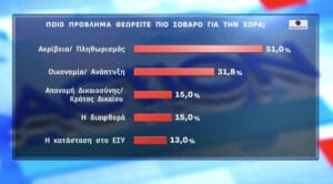 Η ακρίβεια παραμένει το σημαντικότερο και σοβαρότερο πρόβλημα που αντιμετωπίζει η χώρα με ποσοστό 51% ενώ στη δεύτερη θέση βρίσκεται το συναφές ζήτημα της οικονομίας με ποσοστό 31,8%.