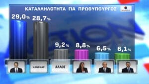 Ο Κυριάκος Μητσοτάκης παραμένει πρώτος στην καταλληλότητα για πρωθυπουργός με 29%, ενώ το 28,7% των πολιτών απαντά «κανένας». Παράλληλα, το 80,7% θεωρεί ότι οι γεωστρατηγικές αναταράξεις απαιτούν πολιτική σταθερότητα και ισχυρή ηγεσία.