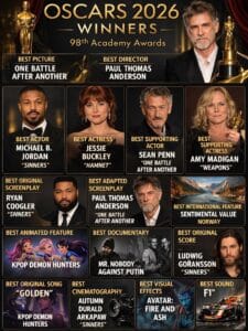 Ο Michael B. Jordan κατέκτησε το Όσκαρ Α΄ Ανδρικού Ρόλου για την ταινία Sinners, σε μια ερμηνεία που συγκέντρωσε εξαιρετικές κριτικές και τον ανέδειξε ως έναν από τους σημαντικότερους ηθοποιούς της χρονιάς. Η Jessie Buckley απέσπασε το Όσκαρ Α΄ Γυναικείου Ρόλου για το Hamnet, επιβεβαιώνοντας τη δυναμική της παρουσία στο διεθνές σινεμά.