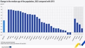 Η Ελλάδα, μαζί με την Πολωνία, εμφανίζει από τις μεγαλύτερες αυξήσεις, ενώ μόνο η Γερμανία και η Μάλτα παρουσίασαν μικρή μείωση της μέσης ηλικίας. Η Σλοβακία και η Κύπρος καταγράφουν τη μεγαλύτερη αύξηση (+4,0 έτη), ακολουθούμενες από την Ιταλία (+3,9 έτη), ενώ η Ελλάδα και η Πολωνία βρίσκονται στην τέταρτη θέση με +3,8 έτη.